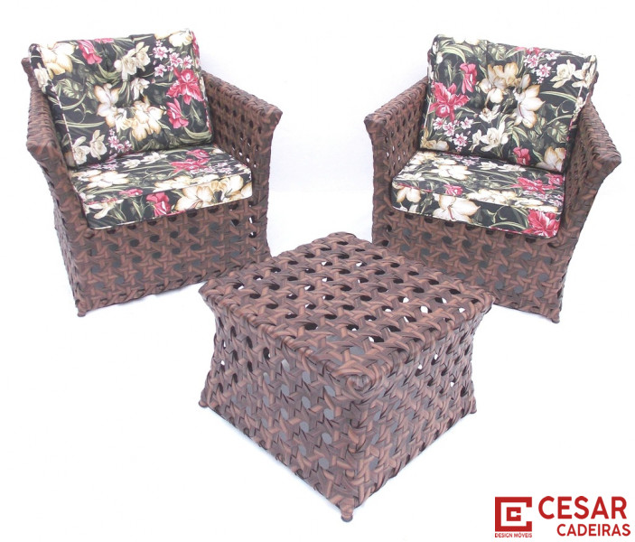 Jogo composto de duas poltronas e uma mesa de centro.