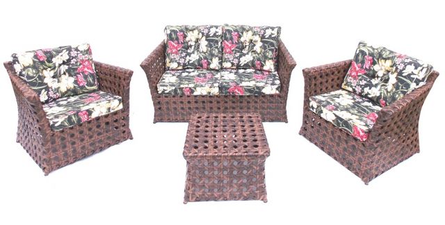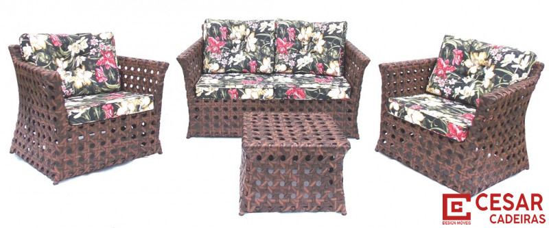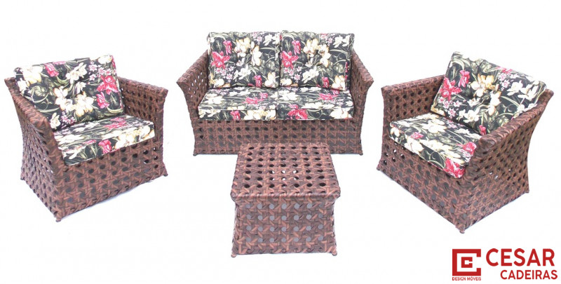 Jogo composto de um sofá de dois lugares, duas poltronas e uma mesa de centro.