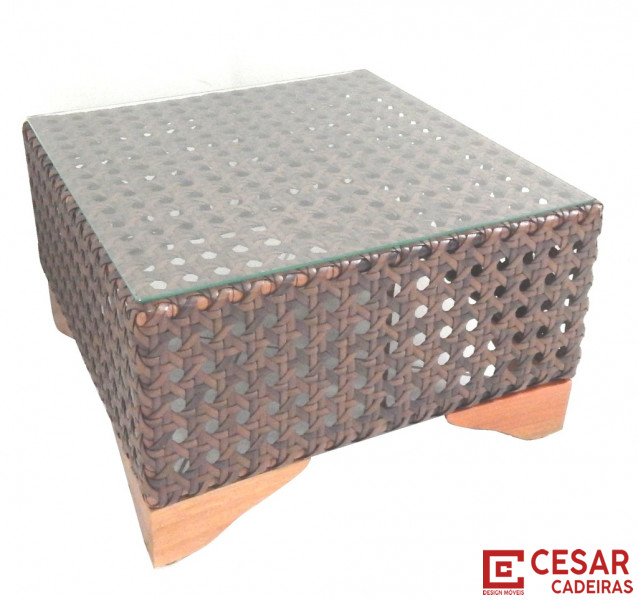 A mesa de centro tem a estrutura em aluminio e revestimento em fibra sintética.
