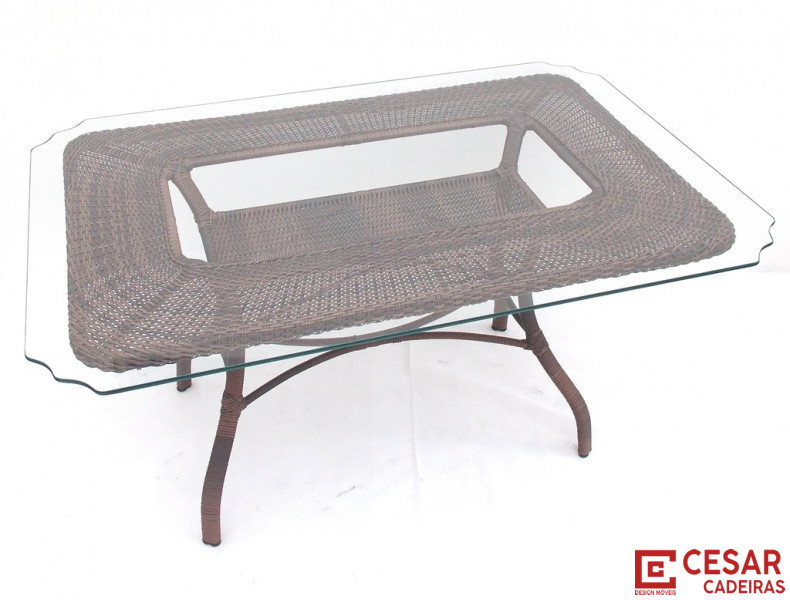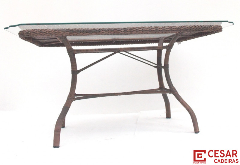 Mesa de jantar, retangular, de junco artificial, com estrutura em aço galvanizado.